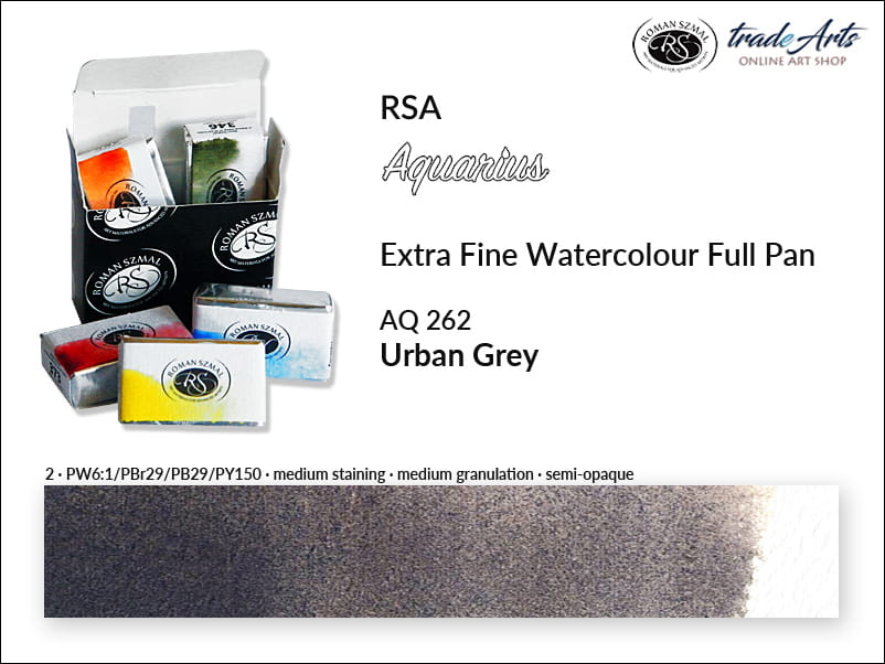 Farba akwarelowa Urban Grey 262 powstała na bazie pigmentów PW6:1, PBR29, PB29 PY150, o doskonałej światłoodporności. Jest półkryjąca, o średnim wnikaniu (staining), średnio granuluje. Temperatura barwowa: ciepła.