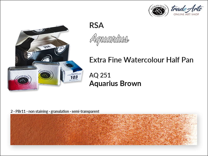 Farba akwarelowa Aquarius Brown 251 powstała na bazie pigmentu PBr11, o doskonałej światłoodporności. Jest półprzezroczysta, brak wnikania (staining), granuluje. Temperatura barwowa: bardzo ciepła.