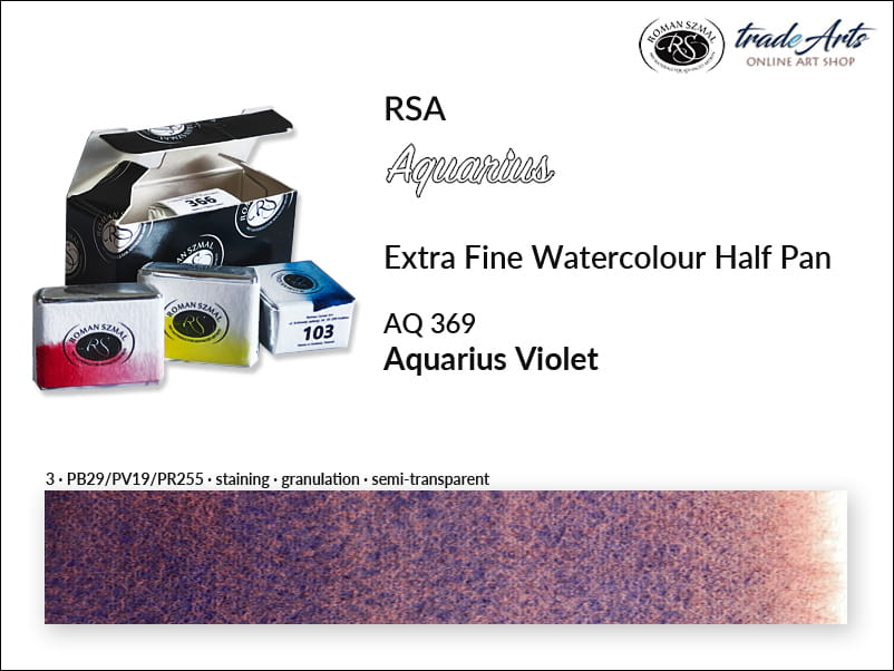 Farba akwarelowa Aquarius Violet 369 powstała na bazie pigmentów PB29, PV19 i PR255, o doskonałej światłoodporności. Jest półprzezroczysta, o trwałym wnikaniu (staining), granuluje. Temperatura barwowa: zimna.