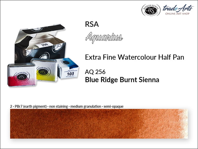 Farba akwarelowa Blue Ridge Burnt Sienna 256 powstała na bazie pigmentu PBr7, o doskonałej światłoodporności. Jest półkryjąca, brak wnikania (staining), średnio granuluje. Temperatura barwowa: bardzo ciepła.