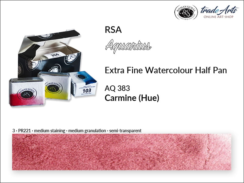 Farba akwarelowa Carmine Hue 383 powstała na bazie pigmentu PR221, o doskonałej światłoodporności. Jest półprzezroczysta, o średnim wnikaniu (staining), średnio granuluje. Temperatura barwowa: ciepła.