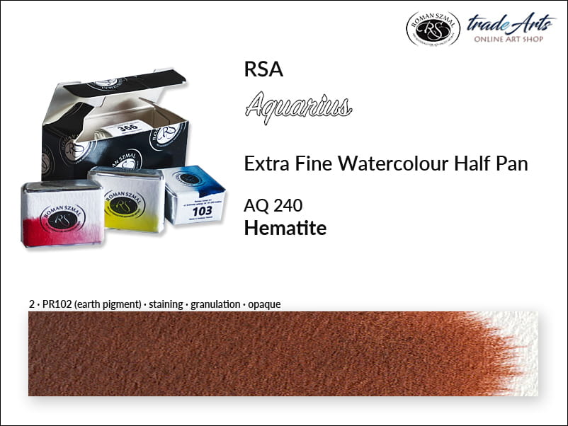 Farba akwarelowa Hematite 240 powstała na bazie pigmentu PR102, o doskonałej światłoodporności. Jest kryjąca, o trwałym wnikaniu (staining), granuluje. Temperatura barwowa: bardzo ciepła.