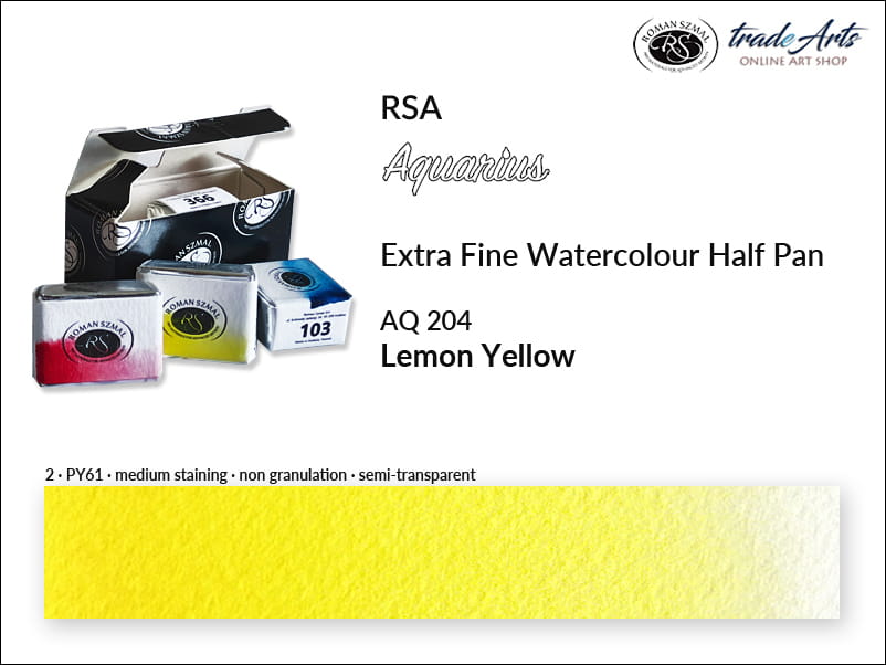 Farba akwarelowa Lemon Yellow 204 powstała na bazie pigmentu PY61, o doskonałej światłoodporności. Jest półprzezroczysta, o średnim wnikaniu (staining), nie granuluje. Temperatura barwowa: ciepła.