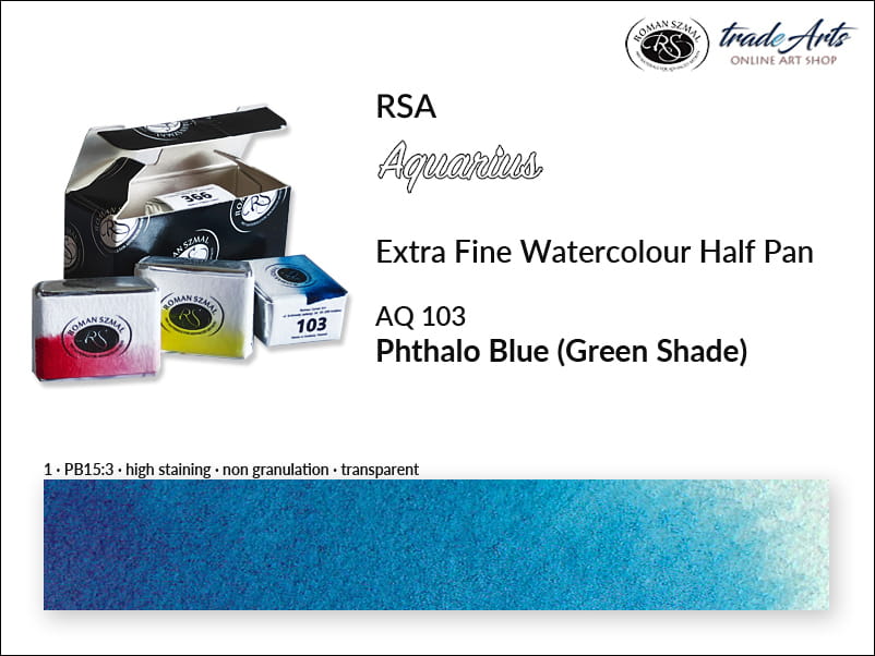 Farba akwarelowa Phthalo Blue (Green Shade) 103 powstała na bazie pigmentu PB15:3, o doskonałej światłoodporności. Jest przezroczysta, o średnim wnikaniu (staining), nie granuluje. Temperatura barwowa: bardzo zimna.