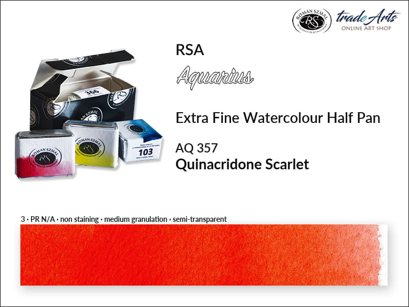 Farba akwarelowa Quinacridone Scarlet 357 powstała na bazie pigmentu PR N/A, o doskonałej światłoodporności. Jest półprzezroczysta, o średnim wnikaniu (staining), nie granuluje. Temperatura barwowa: bardzo ciepła.
