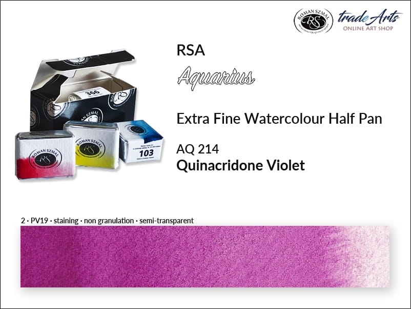 Farba akwarelowa Quinacridone Violet 214 powstała na bazie pigmentu PV19, o doskonałej światłoodporności. Jest półprzezroczysta, o trwałym wnikaniu (staining), nie granuluje. Temperatura barwowa: zimna.