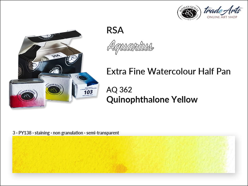 Farba akwarelowa Quinophthalone Yellow 362 powstała na bazie pigmentu PY138, o doskonałej światłoodporności. Jest półprzezroczysta, o trwałym wnikaniu (staining), nie granuluje. Temperatura barwowa: ciepła.
