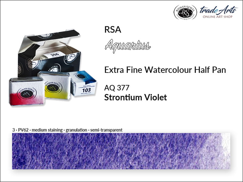 Farba akwarelowa Strontium Violet 377 powstała na bazie pigmentu PV62, o doskonałej światłoodporności. Jest półprzezroczysta, o średnim wnikaniu (staining), granuluje. Temperatura barwowa: zimna.