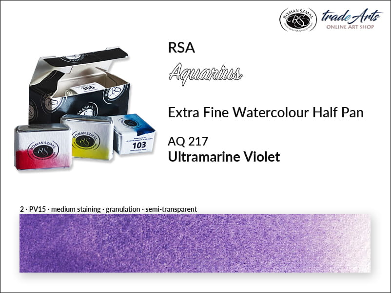 Farba akwarelowa Ultramarine Violet 217 powstała na bazie pigmentu PV15, o doskonałej światłoodporności. Jest półprzezroczysta, o średnim wnikaniu (staining), średnia granulacja. Temperatura barwowa: zimna.