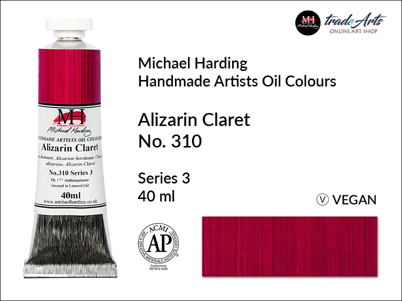 Alizarin Claret No. 310 - ma nieco jaśniejszy ton niż Alizarin Crimson, a mimo to ma większą odporność na światło UV niż Alizarin Crimson. Piękny, pełny kolor dla tych artystów, którzy niechętnie używają Alizarin Crimson. Dzięki swojej wszechstronności i pięknu Alizarin Claret jest idealny do portretów, krajobrazów i prac niefiguratywnych, a mieszanie go z innymi przezroczystymi kolorami jest przyjemnością.
