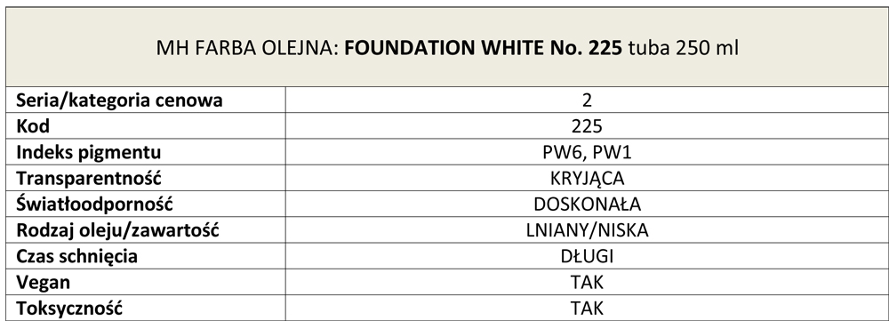 Foundation White No. 225 to mieszanka 50/50 bieli tytanowej i ołowianej zmielonej z olejem lnianym i łączącą zalety każdej z nich. Ta biel może być nakładana na płótna akrylowe lub klejone. W normalnych warunkach artysta może malować na Foundation White w ciągu 4 do 5 dni. Jeżeli farba jest zbyt gęsta aby nakładać ją pędzlem, należy rozcieńczyć ją niewielką ilością terpentyny.
