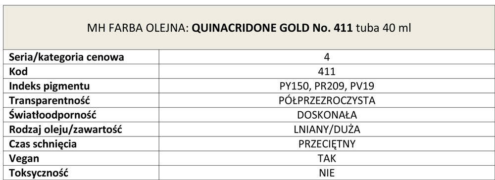 Quinacridone Gold No. 411 jest wykonany z połączenia Azo Nickel i chinakrydonu. Jest organiczny, przezroczysty i ma średni czas schnięcia. Posiada również doskonałą światłotrwałość i wysoką moc barwienia. Jest to bogaty, bursztynowy, złocistożółty kolor, który jest przezroczysty i idealny do glazurowania lub mieszania w celu uzyskania interesujących odcieni. Jego przejścia tonalne są wyraźne, z bogatym przezroczystym pomarańczowo-brązowym. Jest piękny, doskonały pod każdym względem, szczególnie dla artystów, którzy lubią glazurować lub po prostu szaleć z kolorem.