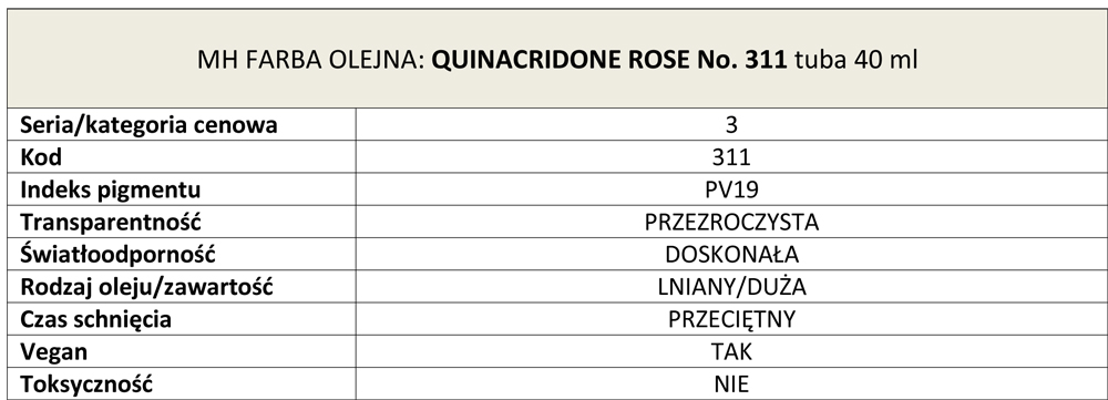 Quinacridone Rose No. 311 - Absolutnie piękna, ciepła czerwień o bardzo wyjątkowym charakterze, po zmieszaniu z bielą lub na jej powierzchni daje naprawdę szokujący odcień różu. To nowoczesny organiczny kolor idealny do malowania żywych martwych natur kwiatów, owoców lub w obrazach portretowych. Ten wyjątkowy kolor tworzy bardzo egzotyczne róże, które mogą spodobać się malarzowi Plein Air dla nieba, pól, kwiatów i światła słonecznego i in.