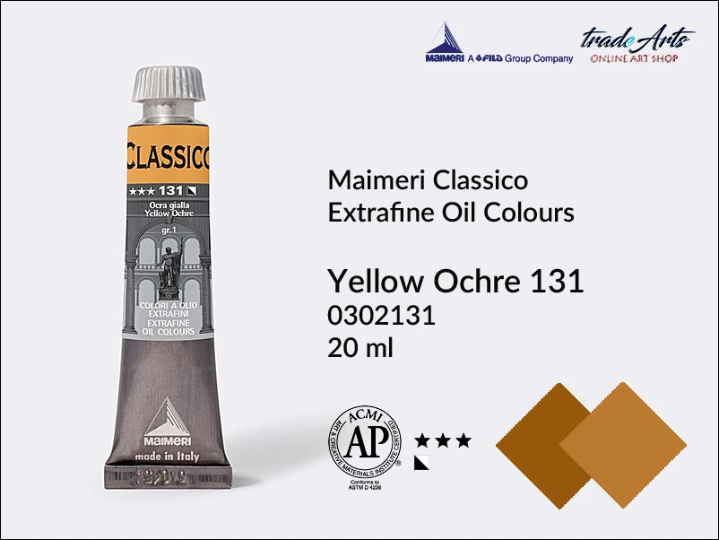Farba olejna Maimeri Classico: Yellow Ochre 131 zawiera pigment Synthetic Iron Oxide-Zinc Oxide-Natural Iron Oxide, jest półkryjąca.