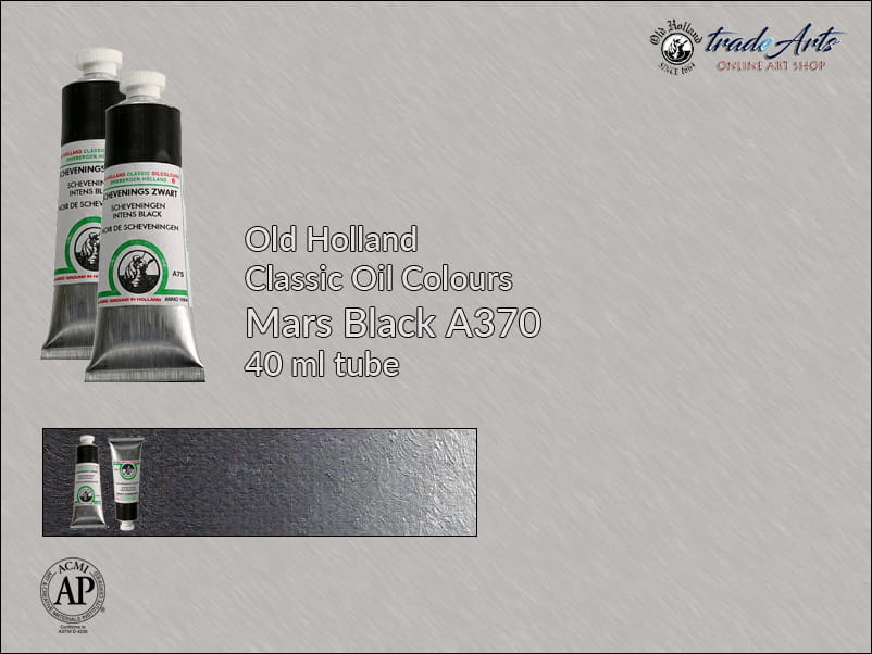 Farba olejna: Mars Black A370 jest kryjąca, zawiera pigment: Synthetic Iron Oxide, światłoodporność wg ASTM kategoria 1 i 2.