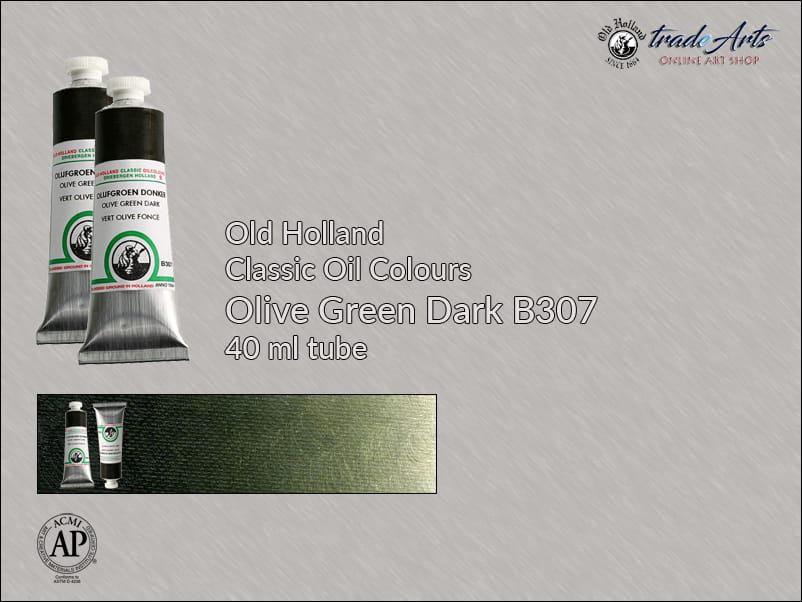 Farba olejna: Olive Green Dark B307 jest kryjąca, zawiera pigment: Natural Umber-Indathrone-Methine Copper-Complex-Phthalocyanine, światłoodporność wg ASTM kategoria 1 i 2.