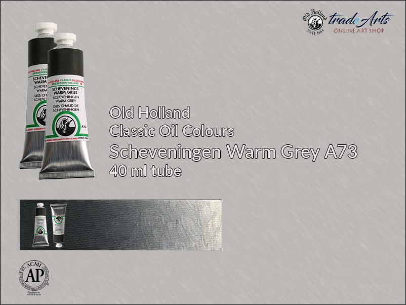 Farba olejna: Scheveningen Warm Grey A73 jest kryjąca, zawiera pigment: Titanium Dioxide-Bone Black-Natural Umber, światłoodporność wg ASTM kategoria 1 i 2.