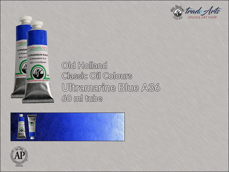 Farba olejna: Ultramarine Blue A36 jest półkryjąca, zawiera pigment: Synthetic Ultramarine, światłoodporność wg ASTM kategoria 1 i 2.