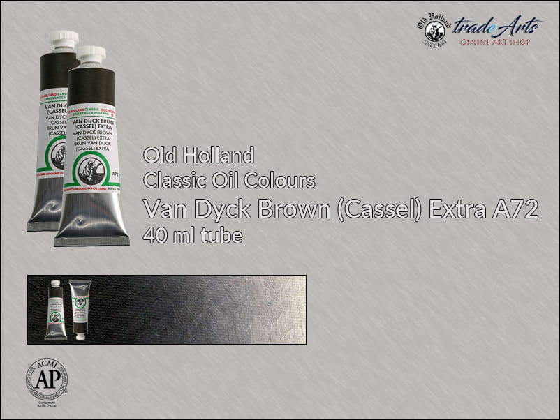 Farba olejna: Van Dyck Brown Extra (Cassel) A72 jest kryjąca, zawiera pigment: Bone Black-Synthetic Iron Oxide, światłoodporność wg ASTM kategoria 1 i 2.