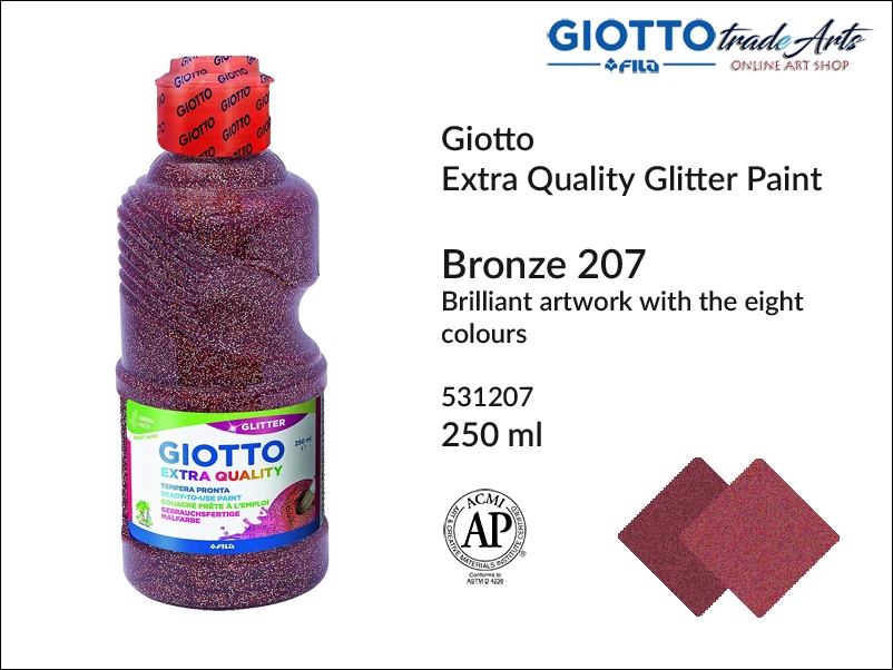 Farba temperowa brokatowa Giotto idealnie nadaje się do specjalnych projektów artystycznych w szkole lub w domu. Na bazie wody, w bezpiecznych kolorach, wszystkie gotowe do użycia. Farby Giotto są wyposażone w nasadkę dozującą i ergonomiczny uchwyt. Złote i srebrne farby brokatowe są wykonane z przezroczystego żelu i mogą być używane jako wykończenie lub do ozdabiania rysunków i przedmiotów. Farby można zmywać z rąk, ale wszelkie plamy na tkaninach należy przetrzeć suchym mydłem, gdy są jeszcze świeże i natychmiast wyprać w pralce w 40 stopniach.