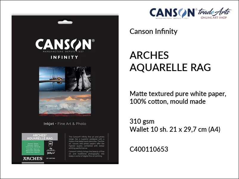 Papier do wydruków Infinity Arches Aquarelle Rag jest teksturowany o czystej bieli, z efektem matowym, o gramaturze 310 gsm, konfekcjonowanie: 10 ark. A4 w foliowej saszetce (wallet).