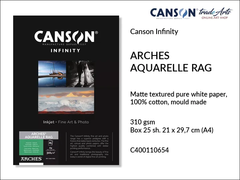 Papier do wydruków Infinity Arches Aquarelle Rag jest teksturowany o czystej bieli, z efektem matowym, o gramaturze 310 gsm, konfekcjonowanie: 25 ark. A4 w pudełku (box).