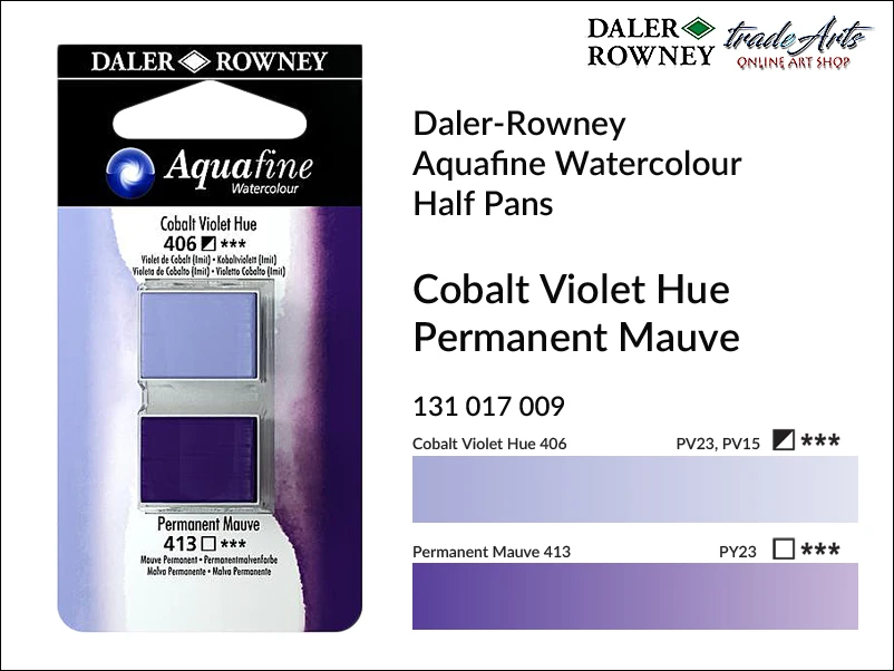Blister zawiera półkostki akwarelowe: 406 Cobalt Violet Hue (półkryjąca, o dobrej światłoodporności) oraz 413 Permanent Mauve (transparentna o dobrej światłoodporności).