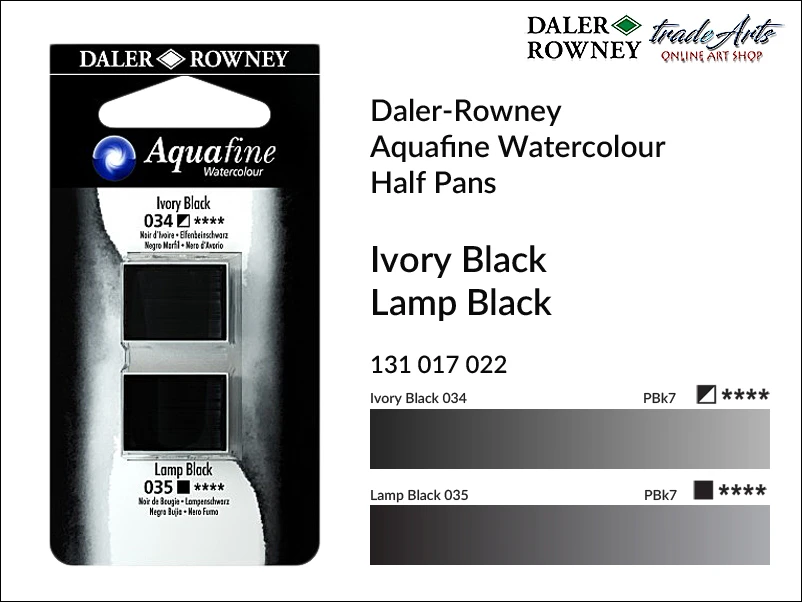 Blister zawiera półkostki akwarelowe: 034 Ivory Black (półkryjąca, o doskonałej światłoodporności) oraz 035 Lamp Black (kryjąca o doskonałej światłoodporności).