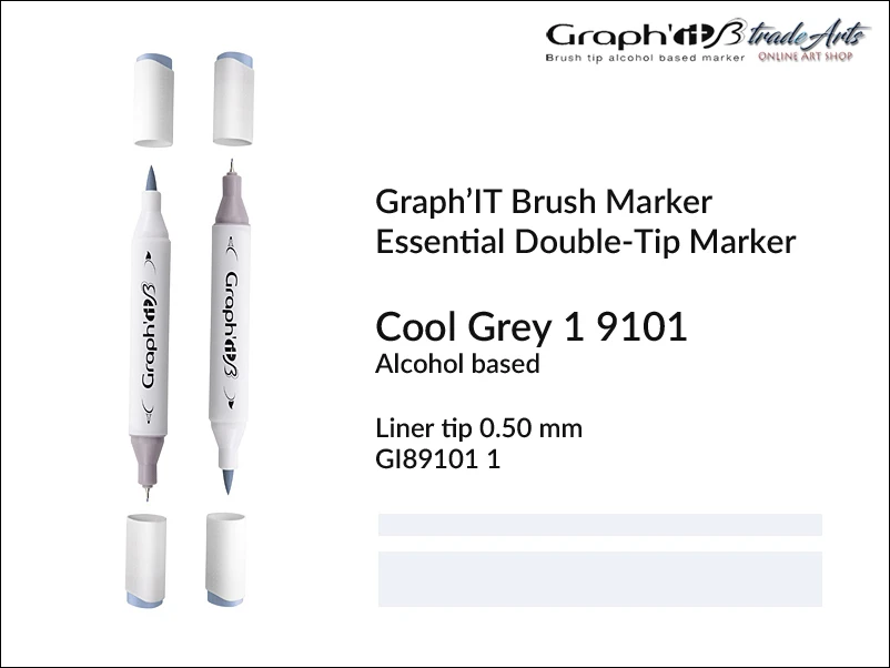 Nowa generacja markerów alkoholowych Graph'it (Oz International). Markery z podwójną końcówką - jedna o średnicy 0,5 mm do zaznaczania konturów, detali i precyzyjnych szczegółów - druga - miękka i elastyczna do wypełniania większych powierzchni. Tusz wysycha bardzo szybko. Zastosowanie: zwłaszcza na grubszym papierze, kartonie. Markery dla artystów, plastyków i hobbystów (scrapbooking i in.).