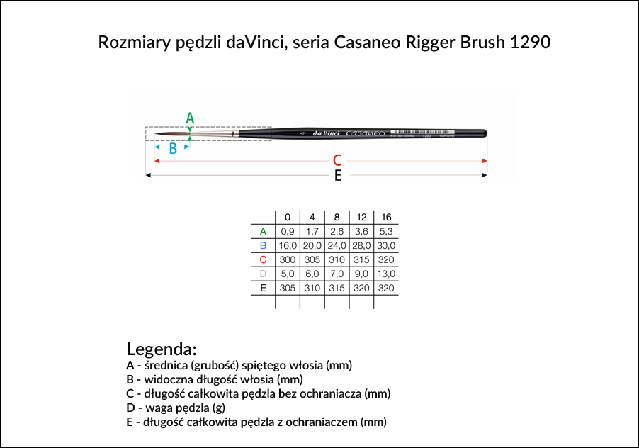 Najwyższej jakości pędzle okrągłe do farb akwarelowych da Vinci Casaneo; doskonała, syntetyczna imitacja wiewiórki kazańskiej: superelastyczne i miękkie włosie idealnie absorbujące farbę i odpowiednio ją dozując na podłoże. Pędzel Casaneo Rigger do akwareli o średniej długości włosia. Idealny do tworzenia precyzyjnych linii, liternictwa. Krótki profilowany (esagonalny) i lakierowany na czarno trzonek, srebrna skuwka.