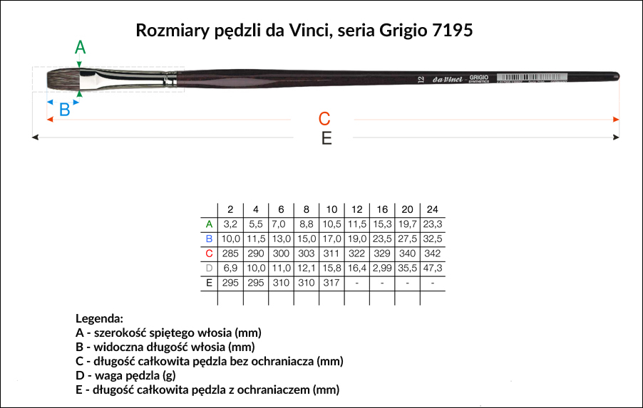 Seria da Vinci GRIGIO 7195 - pędzle płaskie do subtelnych wymalowań farbami olejnymi oraz różnorodnych technik akrylowych; doskonała, syntetyczna imitacja włosia mangusty: syntetyczne włókna o chropowatej strukturze absorbujące farbę, która jest równomiernie uwalniana. Długi profilowany (esagonalny) i lakierowany na bordowo trzonek, srebrna skuwka.