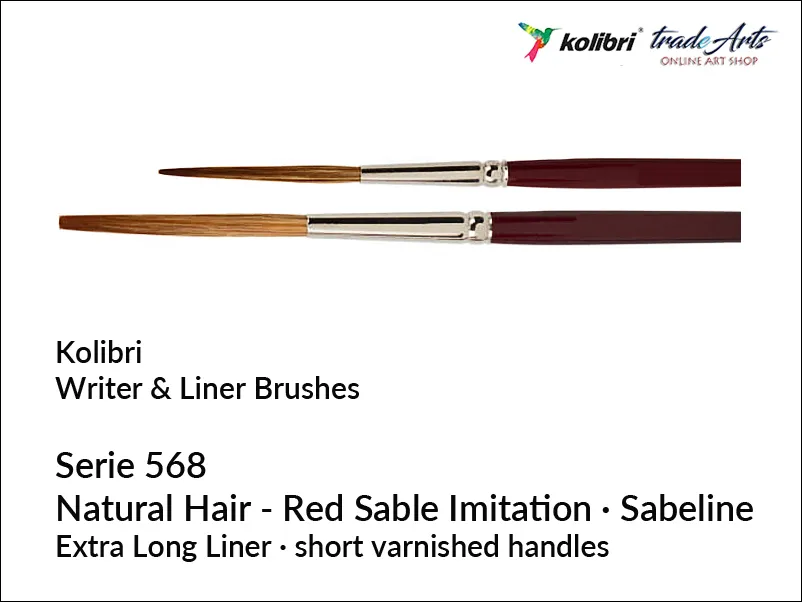 Specjalny pędzel do liternictwa z prostą końcówką, liner. Włosie naturalne - imitacja czerwonej kuny (Red Sable): selekcjonowane włosie z bydlęcej skóry z delikatnymi końcówkami i dobrą elastycznością; bardzo długie. Trzonek krótki lakierowany, bezszwowa skuwka z mosiądzu niklowana. Średnica włosia: 1,90 mm, widoczna długość włosia: 29 mm.