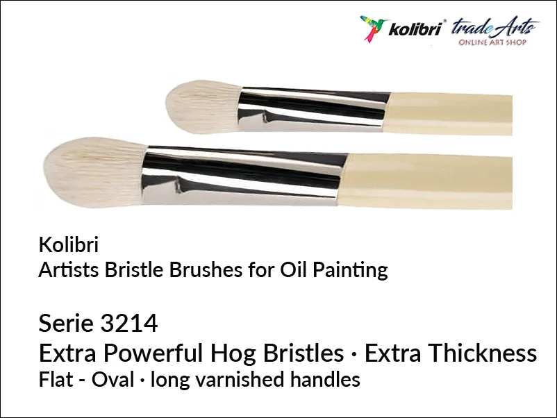 Artystyczny pędzel do farb olejnych Kolibri 3214: włosie wykonane z naturalnej, grubej i bardzo mocnej szczeciny wieprzowej. Bezszwowa niklowana skuwka; długi, lakierowany trzonek.