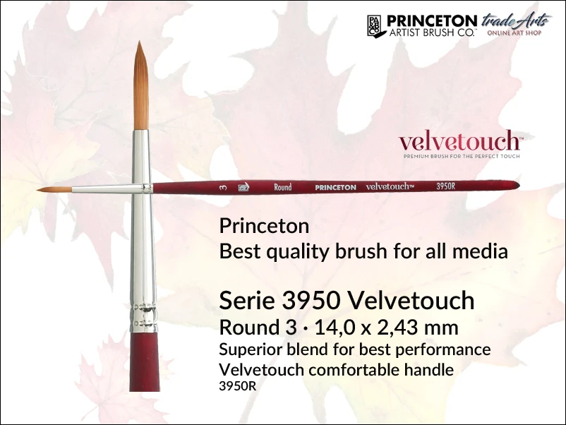 Pędzel Princeton Velvetouch 3950 okrągły z cieniowanej, syntetycznej luksusowej mieszanki, typ Syn-Sable. Włosie sprężyste, mocniejsze od sobolowego, mniej sztywne niż naturalna szczecina; wrażliwe na pociągnięcia pędzlem. Uniwersalny, przeznaczony do wszystkich rodzajów farb akrylowych, akwarelowych i olejnych, także gwaszy. Pędzle najwyższej jakości i najlepszej wydajności. Krótki trzonek wiśniowego koloru, srebrna skuwka. Widoczna długość włosia: 14,00 mm, średnica: 2,43 mm.