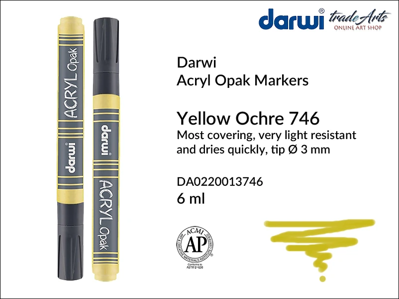 Pisak akrylowy, farba akrylowa kryjąca w pisaku Darwi Acryl Opak, kolor: Yellow Ochre 746