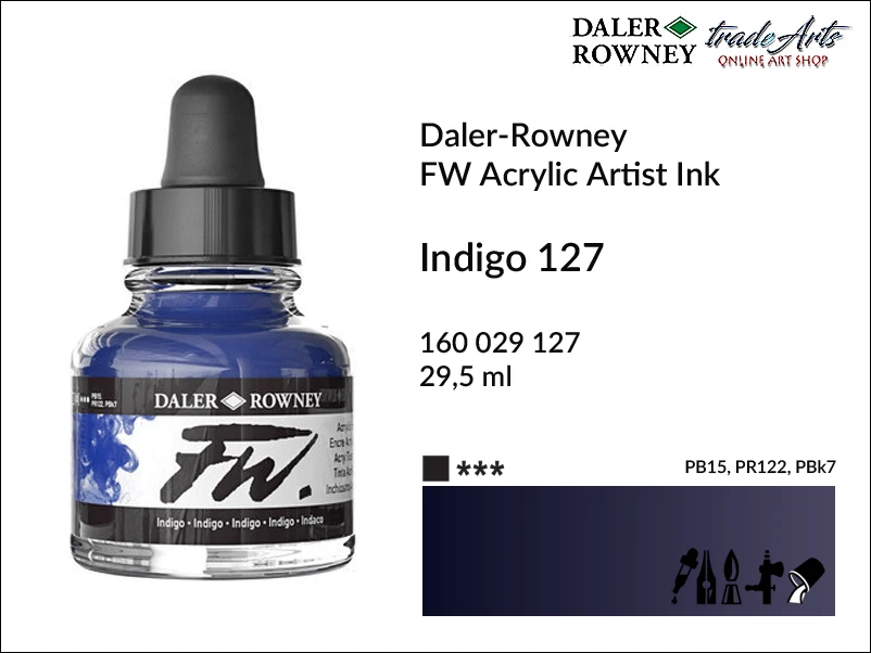 Tusz akrylowy FW Artist's Acrylic Ink został opracowany przez firmę Daler-Rowney z pigmentów artystycznych, wybranych ze względu na ich trwałość, maksymalną stabilność i stopień odporności na światło, rozproszonych w 100% akrylowej emulsji. Kolory są bardzo płynne doskonale mieszalne i wysychające do matowego, trwałego wykończenia. FW Ink może być używany bezpośrednio z zakraplacza lub rozcieńczony wodą w celu uzyskania najbardziej subtelnych tonów podobnych do akwareli. Tusz akrylowy można nakładać za pomocą aerografu, pędzla, markerów do napełniania i piórka technicznego; mogą być używane z gumowymi stemplami i markerami i są doskonałym medium do technik nalewania (pouring), kaligrafii, szablonów, drukowania i malowania na tekstyliach. Idealnie nadają się do tworzenia ilustracji technicznych i precyzyjnie opracowanych rysunków. Są używane przez artystów plastyków, ilustratorów, grafików, kaligrafów, dekoratorów i hobbystów.