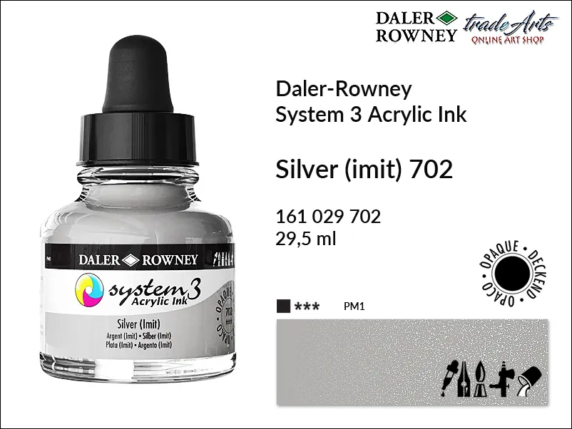 Tusz akrylowy pigmentowy System 3 Acrylic Ink: Silver imit. 702 jest kryjący, powstał z pigmentów PM1, o normalnej światłoodporności. Ciężar właściwy: 1,02 g/cm3.
