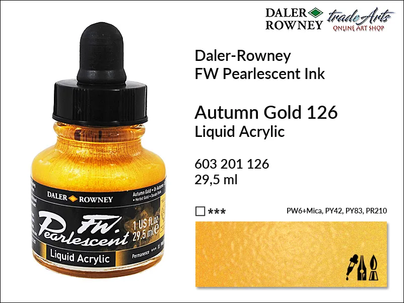 Tusz perłowy akrylowy FW Pearlescent Ink Daler-Rowney, kolor: Autumn Gold 126, opak. 29,5 ml