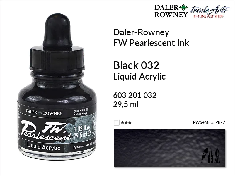 Tusz perłowy akrylowy FW Pearlescent Ink Daler-Rowney, kolor: Black 032, opak. 29,5 ml