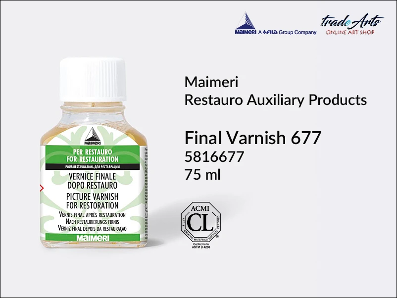 Bezbarwny werniks końcowy, przezroczysty po wyschnięciu. Zawiera węglowodory izoparafinowe. Można rozcieńczać rozcieńczalnikiem 5816601 Maimeri Restauro.