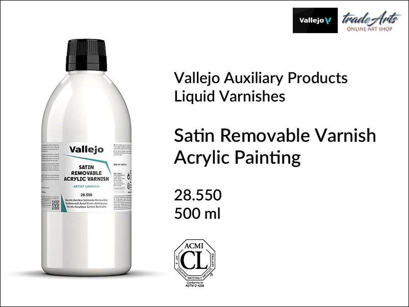 Najwyższej jakości, satynowy akrylowy werniks odwracalny, formuła 100 akrylu z odpornością na promieniowanie UV. Tworzy przezroczystą, satynową i wodoodporną ochronną powłokę na pracach wykonanych akrylami. Nie powoduje zażółceń. Można stosować do malunków wykonanych akrylami na powierzchniach z kartonu, papieru, paper-mache, gipsu, drewna, ceramiki, metalu etc. Szybkoschnący. Doskonałe zastosowanie zarówno do ochrony prac artystycznych jak i rękodzielniczych i modelarskich. Nakładanie pędzelkiem.