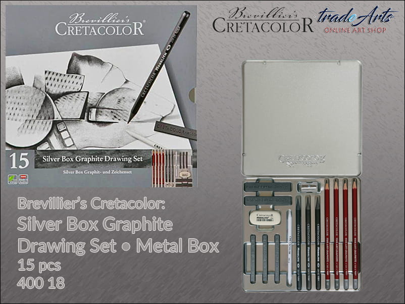 Zestaw do techniki grafitowej Silver Box Graphite Drawing Set Cretacolor, komplet 15 elementów w metalowej kasecie
