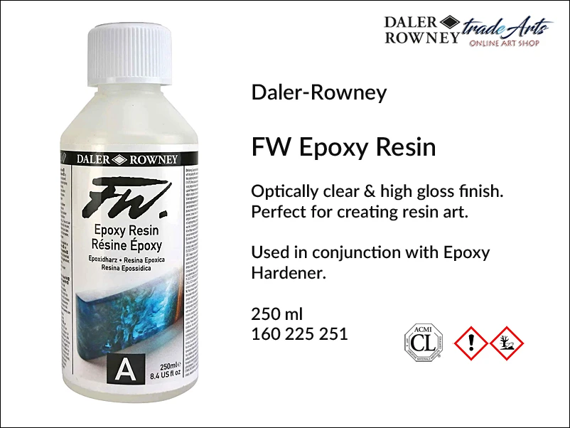 Żywicę epoksydową (Epoxy Resin) Daler-Rowney FW stosuje się w połączeniu z utwardzaczem epoksydowym (Epoxy Hardener), aby uzyskać optycznie przezroczystą grafikę żywiczną o wysokim połysku. Została zoptymalizowana tak, aby wysoko obciążone pigmenty stosowane w atramentach FW tworzyły jasną i żywą grafikę żywiczną. Ma doskonałą odporność na promieniowanie UV, klarowność i przezroczystość, dzięki czemu system epoksydowy FW szczególnie nadaje się do ochrony i dekoracji obrazów, dzieł sztuki, rzeźb i wielu innych.
