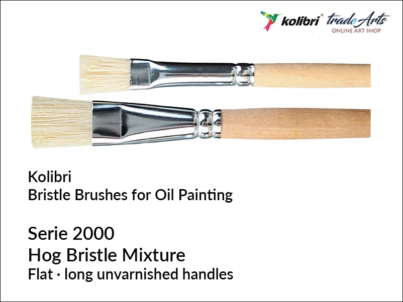 Płaski artystyczny pędzel, wykonany z białej, chińskiej szczeciny, ściśniętej aluminiową skuwką bez szwu; na długim trzonku z nie lakierowanego, surowego drewna.