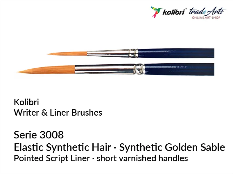 Najwyższej klasy pędzel okrągły do liternictwa i kaligrafii; wykonany ze złotego, o połowę krótszego, syntetycznego włosia, imitującego złotego sobola (Golden Sable). Trzonek krótki, ciemnoniebieski, skuwka srebrna - bezszwowa.