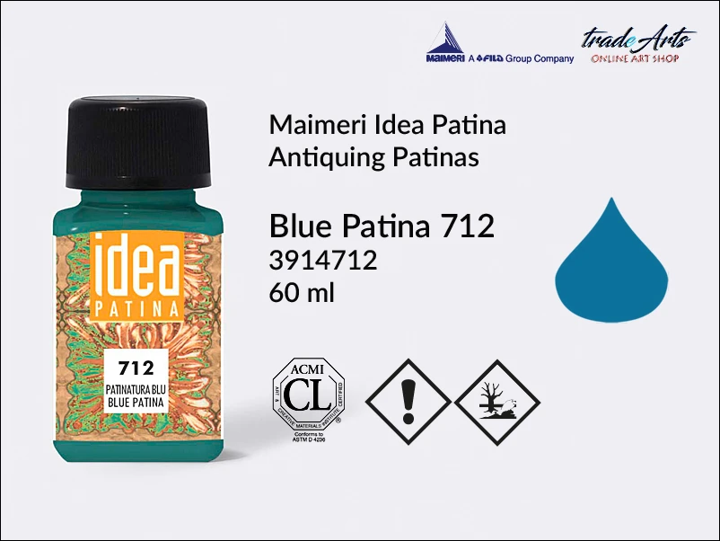 Sól patynująca, na bazie wody, do postarzania (tworzenia patyny) razem z farbami patynującymi Maimeri Idea Patina serii: 138 Gold (złoto) oraz 475 Bronze (brąz). Na całkowicie wyschniętą powierzchnię pomalowaną jedną z w/w farb, pędzelkiem nakłada się sól 712 Blue Patina. Po upływie ok. 1 godziny, na powierzchni pojawia się patyna w kolorze niebieskawym. Uwaga! Produkt jest bardzo szkodliwy, należy chronić przed dostępem dzieci.