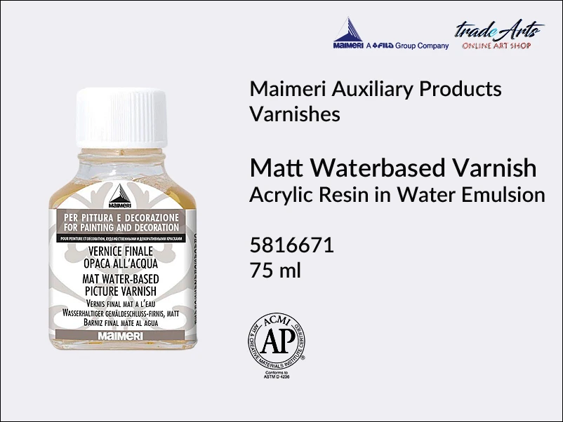 Tworzy jednolitą, kryjącą, odporną na czynniki zewnętrzne powłokę. Nieznacznie zmniejsza świetlistość koloru. Nie zawiera ostro pachnących rozpuszczalników. Uniwersalny (f. olejne i akrylowe). Rozcieńczalny w wodzie. Można mieszać z innymi werniksami na bazie wodnej w celu uzyskania różnych stopni matowości lub połysku. Dobrze wstrząsnąć przed użyciem. Łatwopalny. Skład: 72% żywicy akrylowej w wodnej emulsji, kryjąca krzemionka, stabilizatory, 34% suchego ekstraktu.