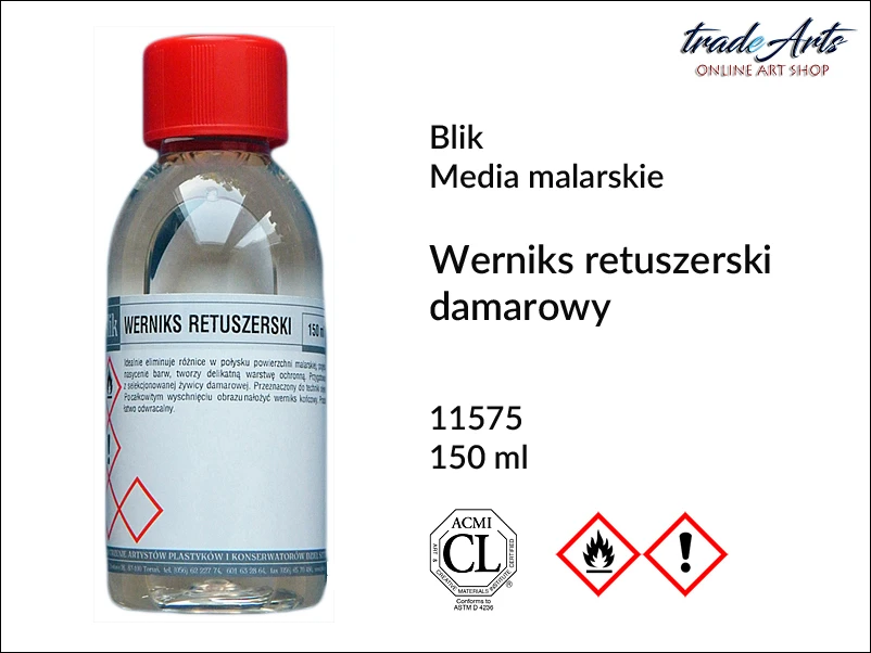 Werniks retuszerski doskonale eliminuje różnice w połysku powierzchni malarskiej, pogłębia nasycenie barw i tworzy delikatną warstwę ochronną.